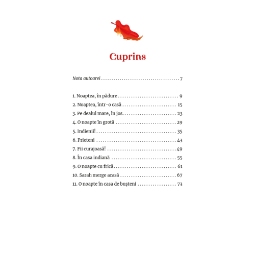 E anul 1707. Sarah Noble, în vârstă de 8 ani, își însoțește tatăl într-o călătorie primejdioasă. Tatăl fetei intenționează să construiască o casă pentru familia Noble. Drumul lor trece prin codri seculari, unde sălășluiesc animale sălbatice periculoase, iar micuța Sarah are nevoie să-și amintească permanent de sfatul mamei: „Fii curajoasă, Sarah Noble!” Provocările sunt mari pentru o fată atât de mică și parcă nimic nu o înspăimântă mai tare decât gândul de a-i întâlni pe temuții indieni.