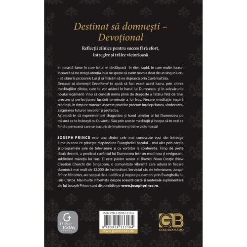 Destinat să domneşti Devoțional te ajută să faci exact acest lucru, prin citirea meditaţiilor zilnice, care te vor adânci în harul lui Dumnezeu și în adevărurile noului legământ. Vino să cunoşti inima plină de dragoste a Tatălui față de tine, precum și perfecțiunea lucrării terminate a lui Isus. Fiecare meditaţie inspiră credință, în timp ce tratează aspecte practice precum înțelepciunea, vindecarea, asigurarea tuturor nevoilor și protecția.