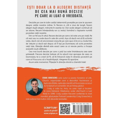 Nu sunt multi oamenii care pot scrie o carte in care ascultarea de Dumnezeu sa para usoara. Dar exact asta a facut pastorul Craig Groeschel cu aceste idei realiste, practice, datatoare de viata. Aceasta nu este pur si simplu o alta carte despre cum sa iei decizii; este mai degraba despre povestea intregii noastre vieti care rezulta in urma deciziilor noastre zilnice. Nu trebuie sa traim la intamplare; putem sa traim cu un scop, cu o directie clara si sa fim o parte a povestirii ample pe care Dumnezeu o tese pe Pamant.