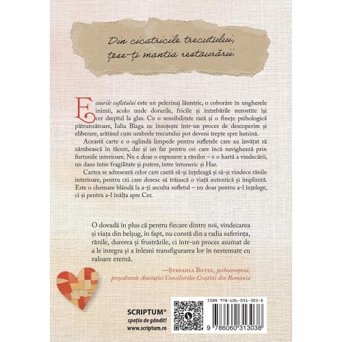 Cu maiestria cuvantului armonios, dar mai ales cu profunzimea autenticitatii vulnerabile, iata o carte nascuta din dorinta profunda de a face loc luminii in toate ungherele umbrite de durere ale sufletului. Un demers al intrebarilor si al cautarilor provocate de suferinta multifatetata, ce ilustreaza viu si personalizat acel proces de a cauta sensul si vindecarea procesand sau cum spune apostolul: „bajbaind”....macar ca nu este departe de fiecare din noi” (Fapte 17:27). Cartea Iuliei Blaga este (inca) o dovada ca, pentru fiecare dintre noi, vindecarea si viata din belsug, in fapt, nu consta in a radia suferinta, ranile, durerea si frustrarile, ci intr-un proces asumat de a le integra si a inlesni transfigurarea lor in nestemate cu valoare eterna. Cu real talent literar, cu o structura ce puncteaza si clarifica, cartea imbogateste registrul lecturilor de analiza si introspectie, din perspectiva spiritualitatii biblice. Esti invitat sa patrunzi, alaturi de autoare, pe drumul dureros, dar vindecator, al analizei constiente - un demers „la pas cu Dumnezeu” spre sfintirea si „invesnicirea” existentei.