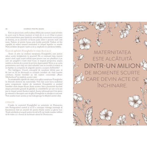 Aceasta carte minunata ofera empatie profunda si intelegere femeilor care se confrunta cu stresul si provocarile maternitatii. De asemenea, ofera o viziune clara asupra scopului lor profund si speranta de care au nevoie pentru a trai intr-un mod vibrant si semnificativ in acest rol divin. Recomand cu caldura aceasta carte.