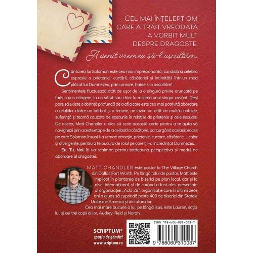 Sentimentele fluctueaza atat de usor de la o singura privire aruncata pe furis sau o atingere, la un sarut sau chiar la rostirea unui singur cuvant. Desi pare sa existe o dorinta profunda de a afla care este cea mai potrivita abordare a relatiilor dintre un barbat si o femeie, ne lovim de atat de multa confuzie, suferinta si teama cauzate de esecurile in relatiile de prietenie si cele sexuale. De aceea, Matt Chandler a ales sa scrie aceasta carte pentru a te ajuta sa navighezi prin aceste etape de la celibat la casatorie, parcurgand acelasi proces pe care Solomon insusi l-a urmat: atractie, prietenie, curtare, casatorie … chiar si divergente, pentru a te bucura de rolul pe care ti l-a incredintat Dumnezeu.