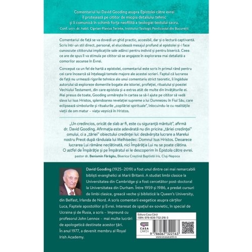 Comentariul de față se va dovedi un ghid practic, accesibil, dar și o lectură captivantă. Scris într-un stil direct, personal, el elucidează mesajul profund al epistolei și-i face cunoscute cititorului implicațiile sale adânci pentru individ și pentru biserică. Ceea ce are de spus îl va stimula pe cititor să se angajeze în explorarea mai detaliată a comorilor ascunse în Evrei.