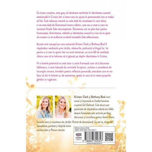Acesta este mesajul pe care autoarele Kristen Clark și Bethany Beal îl răspândesc neobosite prin cărțile, videourile, podcastul și blogul lor. Iar pentru a-ți veni în ajutor într-un mod sintetizat, au scris 60 de meditații zilnice care să te îndrume să-ți găsești pe deplin identitatea în Cristos.