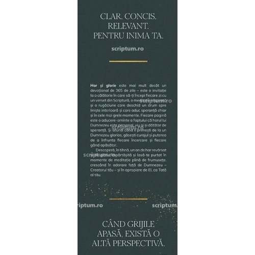 Har si glorie este mai mult decat un devotional de 365 de zile – este o invitatie la o calatorie in care sa-ti incepi fiecare zi cu un verset din Scriptura, o meditatie inspirata si o rugaciune care deschid un drum spre liniste interioara si care aduc speranta chiar si in cele mai grele momente. Fiecare pagina este o aducere-aminte a faptului ca harul lui Dumnezeu este personal, viu si si datator de speranta. Si atunci cand il primesti de la un Dumnezeu glorios, gasesti curajul si puterea de a infrunta fiecare incercare si fiecare gand apasator.