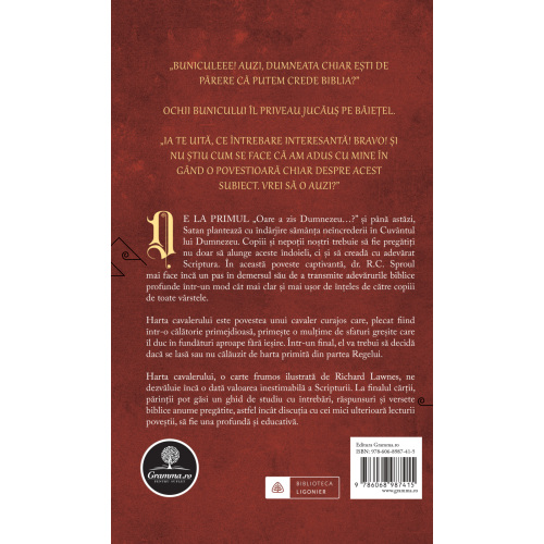 Harta cavalerului, o carte frumos ilustrată de Richard Lawnes, ne dezvăluie încă o dată valoarea inestimabilă a Scripturii. La finalul cărții, părinții pot găsi un ghid de studiu cu întrebări, răspunsuri și versete biblice anume pregătite, astfel încât discuția cu cei mici ulterioară lecturii poveștii, să fie una profundă și educativă.