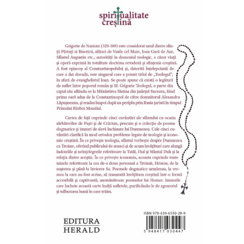 Cele cinci cuvantari clarifica in mod ortodox probleme legate de teologie si iconomie crestina. In ce priveste teologia, sfantul vorbeste despre Dumnezeu ca Treime, oferind publicului de atunci si de acum invataturi care alunga indoielile si neintelegerile referitoare la Tatal, Fiul si Sfantul Duh si la relatia dintre acestia. In ce priveste iconomia, aceasta cuprinde toate tainele referitoare la cea de-a doua persoana a Treimii, Hristos, de la nasterea si pana la invierea Sa. Poemele dogmatice urmareau, la vremea la care au fost scrise, sa transmita invatatura crestina intr-o forma accesibila si captivanta, asemanatoare poemelor lui Homer. Imnurile care incheie aceasta carte inalta sufletele, purificandu-le de zgomotul si tulburarea lumii in care traim