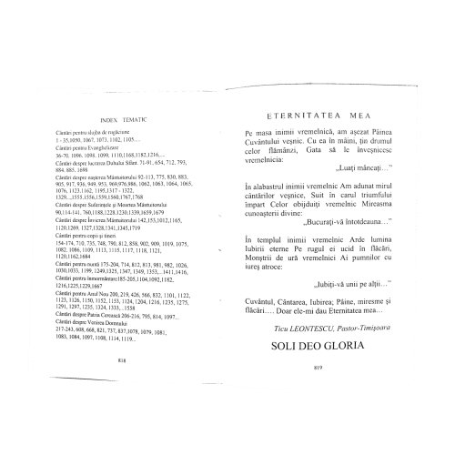 Mulţumesc Bunului Dumnezeu pentru realizarea acestei lucrări, Lui i se cuvine toată Slava şi cinstea în vecii vecilor. Mulţumesc Bisericii unde slujesc pentru ajutorul spiritual şi încurajările oferite şi pentru această carte de cântări. Mulţumesc soţiei prin al cărei sacrificiu de zi cu zi a contribuit nebănuit de mult la această lucrare. Sunt recunoscător lui Dumnezeu pentru părinţii ce mi-au aşezat pe vatra sufletului imaculat al copilăriei cântările Domnului. Tuturor celor ce m-au încurajat, au redactat sau au corectat manuscrisele, le doresc veşnice binecuvântări. Marele reformator Martin Luther a spus: „După teologie cea mai mare cinste o dau muzicii, bineînţeles a muzicii care conduce păcătoşii la Dumnezeu, stârneşte evlavie şi pocăinţă”. Cântările noastre vorbesc de teologia fiecăruia, cei fundamentaţi în Scripturi au imnuri duhovniceşti. Una dintre aceste cântări scrisă în 1523 este o rescriere liberă si expresivă a Ps. 130, iar în această colecţie de imnuri o găsiţi la nr. 1356. În partăşiile zilnice din familie, locul cântării nu poate fi substituit. Am adunat din cântările primite prin Duhul Sfânt în vremuri de trezire spirituală cântări pe care nu avem voie să le uităm, cu mesaj biblic fiind un parteneriat al părtăşiei noastre cu Domnul. Folosiţi aceste imnuri pentru Gloria lui Dumnezeu, zidirea Bisericii Sale, bucuraţi-vă, mângâiaţi-vă şi întăriţi-vă în harul Lui.