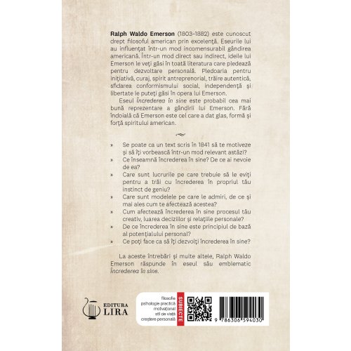 Ralph Waldo Emerson (1803–1882) este cunoscut drept filosoful american prin excelență. Eseurile lui au influențat într-un mod incomensurabil gândirea americană. Într-un mod direct sau indirect, ideile lui Emerson le veți găsi în toată literatura care pledează pentru dezvoltare personală. Pledoaria pentru inițiativă, curaj, spirit antreprenorial, trăire autentică, sfidarea conformismului social, independență și libertate le puteți găsi în opera lui Emerson. Eseul Încrederea în sine este probabil cea mai bună reprezentare a gândirii lui Emerson. Fără îndoială că Emerson este cel care a dat glas, formă și forță spiritului american.