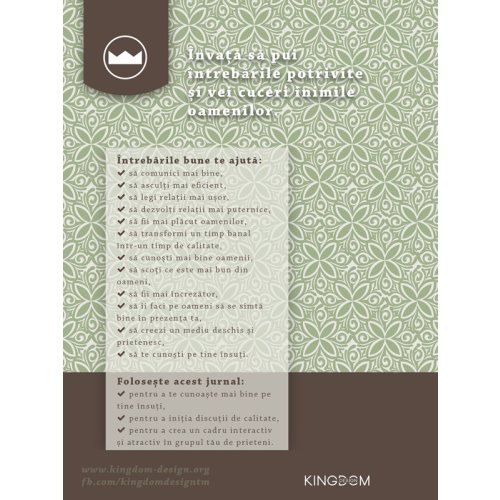 Învață să pui întrebări și vei cuceri inima oamenilor. Cel mai ușor înveți să faci acest lucru practicând abilitatea până devine stil de viață și, în timp, caracteristică naturală. Acest jurnal te poate însoți în dezvoltarea acestei deprinderi.