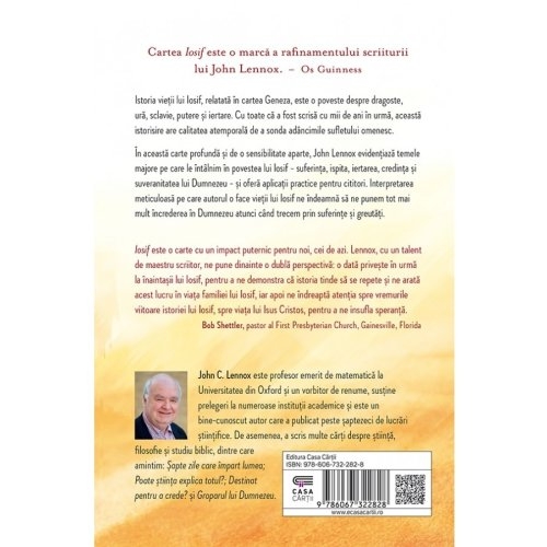 În această carte profundă și de o sensibilitate aparte, John Lennox evidențiază temele majore pe care le întâlnim în povestea lui Iosif – suferința, ispita, iertarea, credința și suveranitatea lui Dumnezeu – și oferă aplicații practice pentru cititori. Interpretarea meticuloasă pe care autorul o face vieții lui Iosif ne îndeamnă să ne punem tot mai mult încrederea în Dumnezeu atunci când trecem prin suferințe și greutăți.