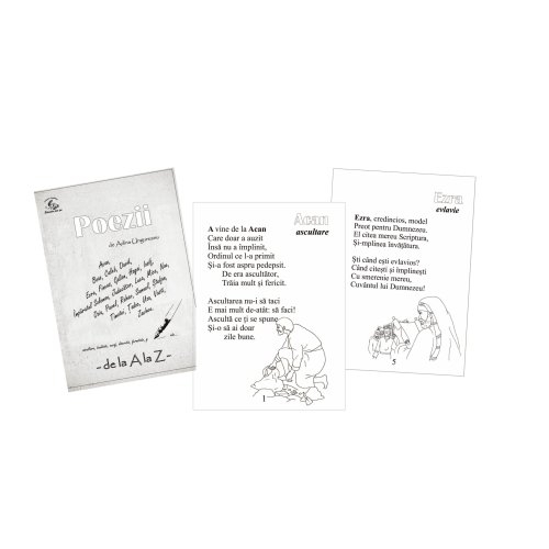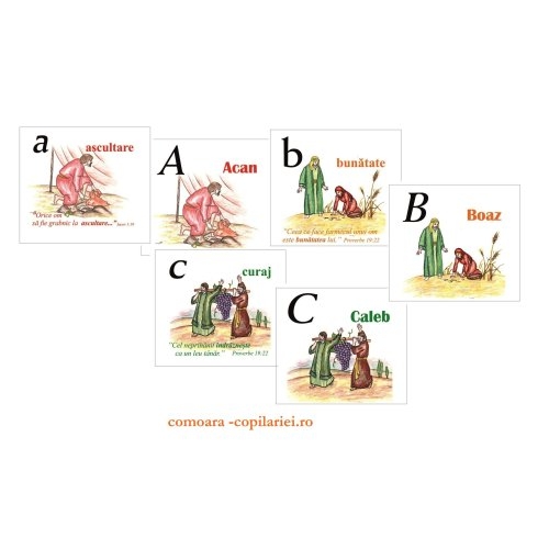 Cele 50 de cartonașe vin în ajutorul copilului pentru a învăța literele alfabetului prin asociere cu personaje Biblice și virtuțile aferente + versete. Pentru a internaliza atât povestirile cât și virtuțile, ai 24 de poezii menite să eficientizeze procesul învățării.