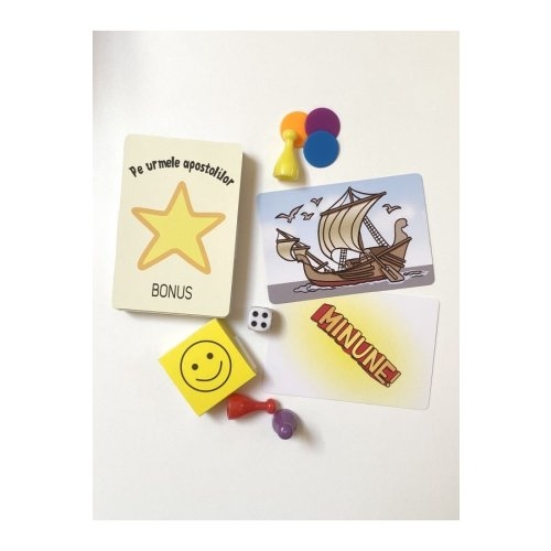 | CUPRINDE | tabla de joc • regulamentul jocului • cartea de povestiri biblice • două zaruri • opt pioni reprezentându-i pe primii creștini din cartea Faptele apostolilor • opt discuri mici din plastic reprezentându-i pe aceiași primi creștini |