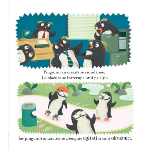 - • Ilustrații atractive și interacțiune: "Lecții de politețe pentru pinguini" se remarcă printr-o serie de ilustrații viu colorate și pline de viață, care aduc în prim-plan lumea fascinantă a pinguinilor și le fac pe lecțiile de politețe să fie ușor de înțeles și atrăgătoare pentru cititorii tineri