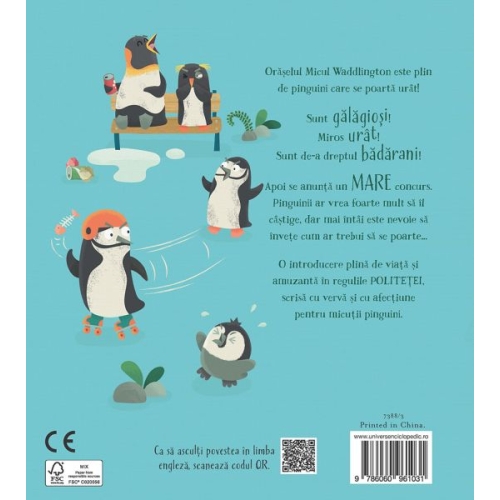 - • Promovarea valorilor de politețe și respect: Prin intermediul unor personaje îndrăgite - pinguinii, cartea își propune să le împărtășească celor mici lecții valoroase despre importanța politeței și a respectului față de ceilalți