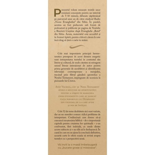 Prezentul volum reuneste textele unor emisiuni concepute pentru un interval de 5-10 minute, difuzate saptamanal pe parcursul unui an de catre studioul Radio „Vocea Evangheliei” din Sibiu. In paralel, acestea au fost prelucrate sub forma de podcasturi si publicate pe pagina de Youtube a Bisericii Crestine dupa Evanghelie „Betel” din Sibiu. Acum, materialul este accesibil si in format tiparit, pentru cititorii carora le este inca drag sa tina o carte in maini.