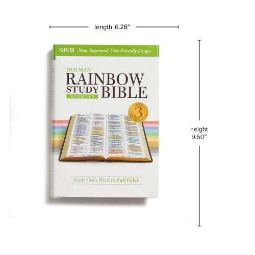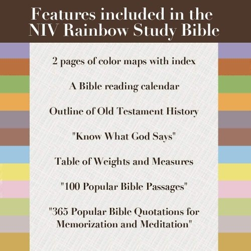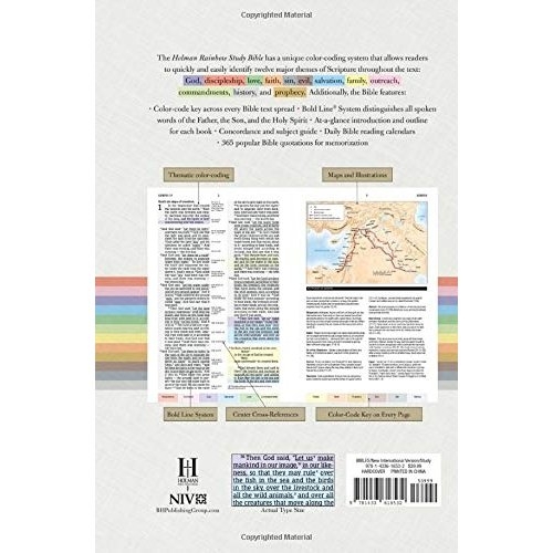 The NIV Rainbow Study Bible is the best-selling, fully color-coded Bible with over three million copies sold. It features a unique color-coding system that allows readers to identify twelve major themes of Scripture throughout the text: God, discipleship, love, faith, sin, evil, salvation, family, outreach, commandments, history, and prophecy. The system also underlines all words directly spoken by God, Jesus, and the Holy Spirit. Together, the unique organization allows you to find the passages meant for your situation—or that of those you care for—faster.