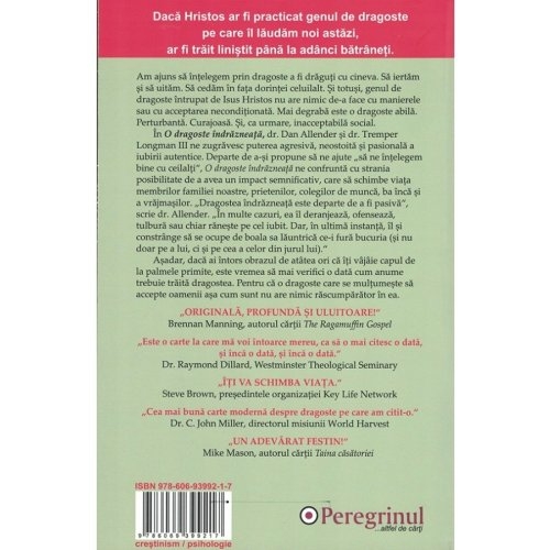 În O dragoste îndrăzneață, dr. Dan Allender și dr. Tremper Longman III ne zugrăvesc puterea agresivă, neostoită și pasională a iubirii autentice. Departe de a-și propune să ne ajute „să ne înțelegem bine cu ceilalți”, O dragoste îndrăzneață ne confruntă cu strania posibilitate de a avea un impact semnificativ, care să schimbe viața membrilor familiei noastre, prietenilor, colegilor de muncă, ba încă și a vrăjmașilor. „Dragostea îndrăzneață este departe de a fi pasivă”, scrie dr. Allender. „În multe cazuri, ea îl deranjează, ofensează, tulbură sau chiar rănește pe cel iubit. Dar, în ultimă instanță, îl și constrânge să se ocupe de boala sa lăuntrică ce-i fură bucuria (și nu doar pe a lui, ci și pe cea a celor din jurul lui).”