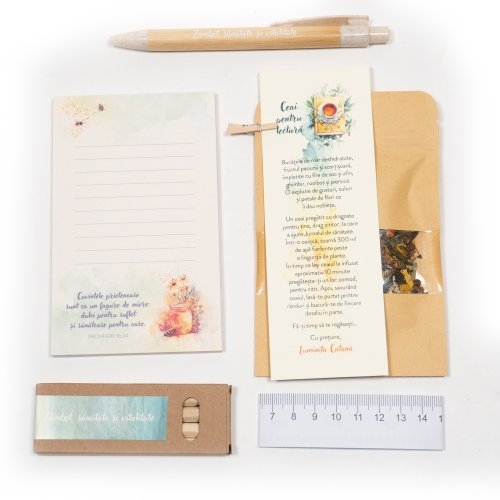 Conținut pachet: 1 x Blocknotes, 1 x Broșură „Farmacia din fereastră”, 1 x Centimetru (1m), 1 x Jurnal de Sănătate, 1 x Miniset creioane colorate, 1 x Pix ecologic personalizat, 1 x pliculeț de ceai, 1 x Semn de carte