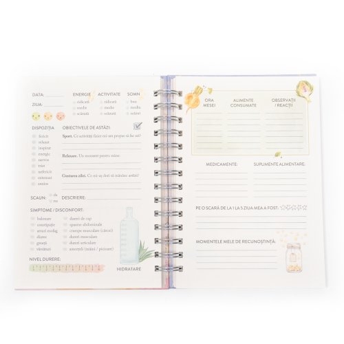 - Monitorizarea stării de spirit: Secțiuni dedicate monitorizării stării tale emoționale zilnice, cu scale de evaluare sau spațiu pentru a descrie sentimentele predominante.