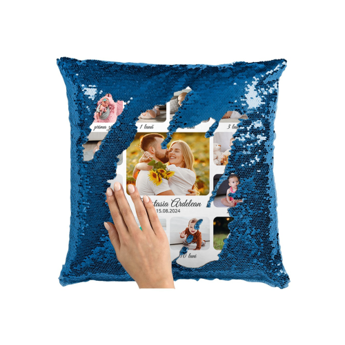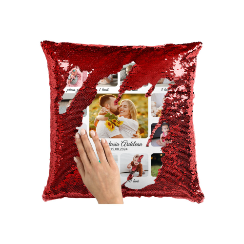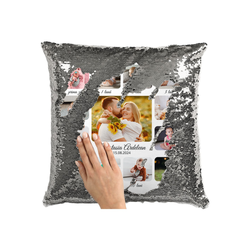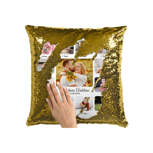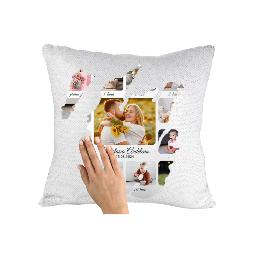 Pernă personalizată cu 13 poze și nume – Nou născut și părinți