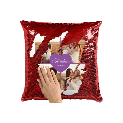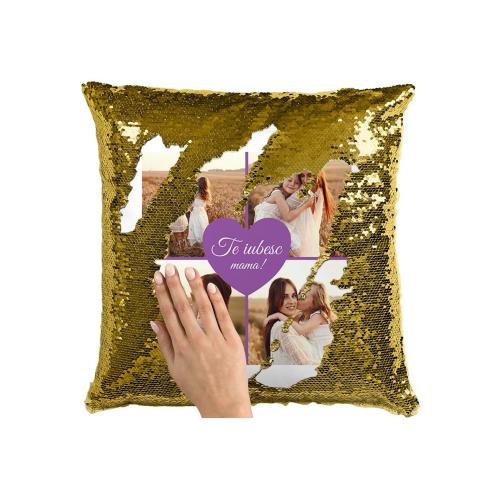 Transformă un obiect obișnuit într-o mărturie de iubire profundă cu perna personalizată cu husa de paiete sublimabile. Această pernă specială, personalizată cu patru poze și mesajul “Te iubesc, Mama,” este un mod minunat de a-ți exprima aprecierea și afecțiunea față de mama ta.