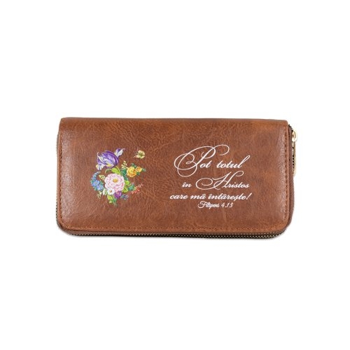 Portofel damă, 2 fermoare, maro inchis, cu imprimeu "Pot totul in Hristos care ma intareste ! "