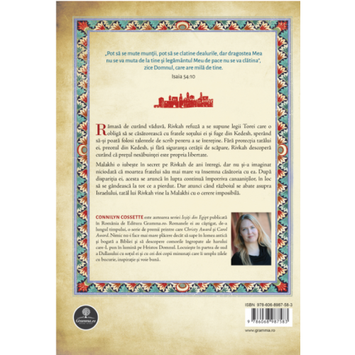 CONNILYN COSSETTE este autoarea seriei Ieșiți din Egipt publicată în Romania de Editura Gramma.ro. Romanele ei au câștigat, de-a lungul timpului, o serie de premii printre care Christy Award și Carol Award. Nimic nu-i face mai mare plăcere decât să sape în lumea antică și bogată a Bibliei și să descopere comorile îngropate ale harului care-L pun în lumină pe Hristos Domnul. Locuiește în partea de sud a Dallasului cu soțul ei și cu cei doi copii minunați care îi umplu zilele cu bucurie, inspirație și voie bună.