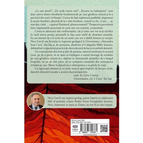 Cartea se adresează atât credincioșilor, cât și celor care vor să-și clarifice în mod sincer poziția personală în fața unor astfel de chestiuni esențiale. Ea are meritul de a fi scrisă de un autor care are o dublă formare și vocație: Nicu Gavril este licențiat în inginerie geologică la Universitatea „Alexandru Ioan Cuza” din Iași și, de asemenea, absolvent al Colegiului Biblic Suceava, dobândind o experiență practică de câteva decenii de lucru în ambele domenii.