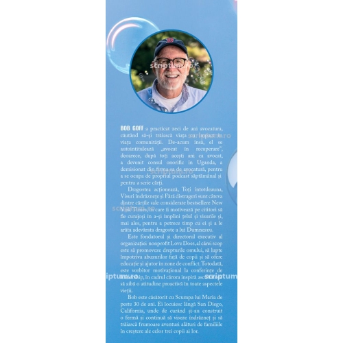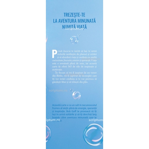 Asaza-te cu incredere in dragostea lui Dumnezeu pentru tine si porneste la drum cu ochii larg deschisi si cu inima plina de asteptari spre o viata mai plina de sens, o credinta mai vie si un viitor trait cu intentie. Cu stilul sau inconfundabil de povestitor si cu o viziune plina de farmec asupra vietii, Bob Goff te invita intr-o calatorie zilnica plina de surprize, unde credinta si viata se impletesc cu umor, curaj si uimire. In paginile acestei carti vei gasi scantei de inspiratie care iti aprind curiozitatea si iti reamintesc ca Dumnezeu Se bucura de relatia cu tine mai mult decat iti poti imagina. Fiecare zi devine o provocare uimitoare: sa lasi in urma frica si sa si sa pasesti cu inima deschisa spre aventuri care dau sens si culoare vietii.