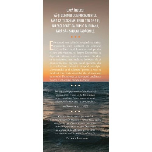 Este timpul sa te schimbi, invatand sa deprinzi obiceiurile care conteaza cu adevarat; sa‑ti evaluezi modul cum te vezi pe tine si care este viziunea ta despre Dumnezeu; sa deprinzi valoarea antrenamentului, nu doar sa te straduiesti mai mult; sa descoperi de ce obiceiurile, mai degraba decat speranta, duc la o schimbare durabila, sa aplici principiul „semanatului si al culesului” pentru a reusi sa modifici traiectoria viitorului tau; sa recunosti puterea lui Dumnezeu ca adevaratul catalizator pentru o schimbare durabila a vietii.