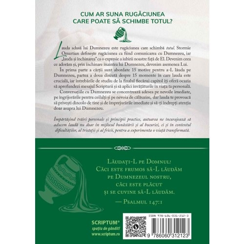 In prima parte a cartii sunt abordate 15 motive pentru a-L lauda pe Dumnezeu, partea a doua discuta despre 15 momente in care lauda este cruciala, iar intrebarile de studiu de la finalul fiecarui capitol iti ofera ocazia sa aprofundezi mesajul Scripturii si sa aplici invataturile in viata ta personala.