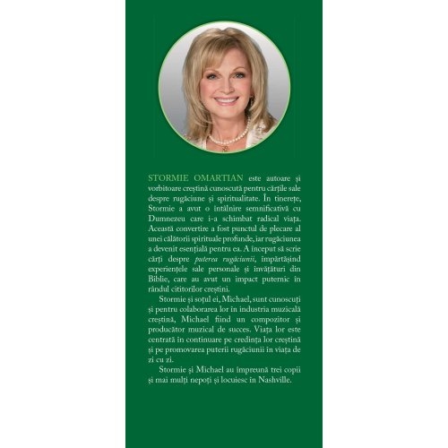 Stormie Omartian este autoare si vorbitoare crestina cunoscuta pentru cartile sale despre rugaciune si spiritualitate. In tinerete, Stormie a avut o intalnire semnificativa cu Dumnezeu care i-a schimbat radical viata. Aceasta convertire a fost punctul de plecare al unei calatorii spirituale profunde, iar rugaciunea a devenit esentiala pentru ea. A inceput sa scrie carti despre puterea rugaciunii, impartasind experientele sale personale si invataturi din Biblie, care au avut un impact puternic in randul cititorilor crestini.