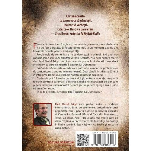 Razboiul vorbelor este o carte care patrunde la radacina problemelor de comunicare, si anume in inima noastra. Doar cand inima Ii este daruita in intregime Domnului, vorbele noastre isi gasesc echilibrul.Cuvintele pot fi folosite pentru a zidi si pentru a incuraja, sau pot fi folosite pentru a darama si a distruge. Biblia ne invata atat de clar cum putem indrepta starea noastra de fapt si cum putem ajunge acolo unde ne vrea Dumnezeu.In ce te priveste, cuvintele tale Ii apartin lui Dumnezeu?