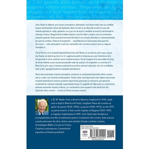 Stott demonstrează o bună cunoaștere a textului și contextului Epistolei către romani, cât și a celor mai recente studii pauline. Poate chiar mai important este faptul că privește această epistolă prin prisma propriei experiențe pastorale și misionare, perspectivă modelată de viziunea măreață a apostolului însuși. În paginile de față aveți un comentariu adresat oamenilor acestui mileniu, un comentariu care acoperă cele două lumi ale Epistolei către romani - lumea lui Pavel și lumea noastră.