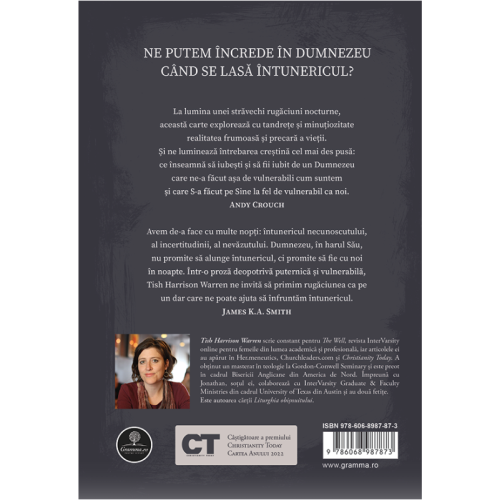 Avem de-a face cu multe nopți: întunericul necunoscutului, al incertitudinii, al nevăzutului. Dumnezeu, în harul Său, nu promite să alunge întunericul, ci promite să fie cu noi în noapte. Într-o proză deopotrivă puternică și vulnerabilă, Tish Harrison Warren ne invită să primim rugăciunea ca pe un dar care ne poate ajuta să înfruntăm întunericul.