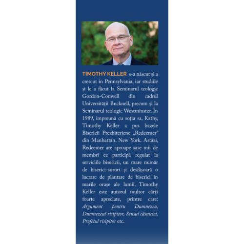 TIMOTHY KELLER s-a născut și a crescut în Pennsylvania, iar studiile și le-a făcut la Seminarul teologic Gordon-Conwell din cadrul Universității Bucknell, precum și la Seminarul teologic Westminster. În 1989, împreună cu soția sa, Kathy, Timothy Keller a pus bazele Bisericii Prezbiteriene „Redeemer” din Manhattan, New York. Astăzi, Redeemer are aproape șase mii de membri ce participă regulat la serviciile bisericii, un mare număr de biserici-surori și desfășoară o lucrare de plantare de biserici în marile orașe ale lumii. Timothy Keller este autorul multor cărți foarte apreciate, printre care: Argument pentru Dumnezeu, Dumnezeul risipitor, Sensul căsniciei, Profetul risipitor etc.
