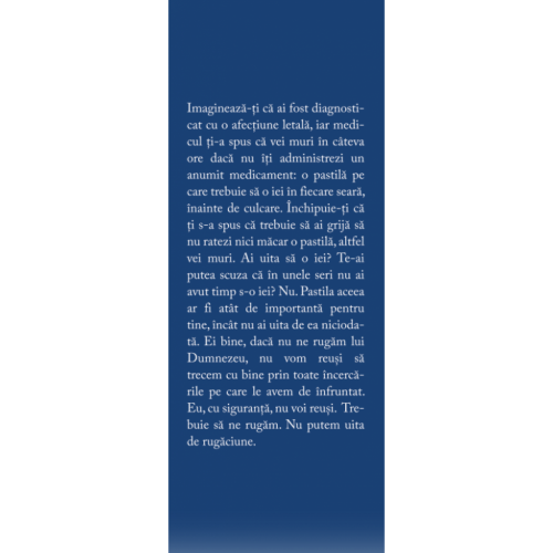 Imaginează-ți că ai fost diagnosticat cu o afecțiune letală, iar medicul ți-a spus că vei muri în câteva ore dacă nu îți administrezi un anumit medicament: o pastilă pe care trebuie să o iei în fiecare seară, înainte de culcare. Închipuie-ți că ți s-a spus că trebuie să ai grijă să nu ratezi nici măcar o pastilă, altfel vei muri. Ai uita să o iei? Te-ai putea scuza că în unele seri nu ai avut timp s-o iei? Nu. Pastila aceea ar fi atât de importantă pentru tine, încât nu ai uita de ea niciodată. Ei bine, dacă nu ne rugăm lui Dumnezeu, nu vom reuși să trecem cu bine prin toate încercările pe care le avem de înfruntat. Eu, cu siguranță, nu voi reuși. Trebuie să ne rugăm. Nu putem uita de rugăciune. --- Timothy Keller