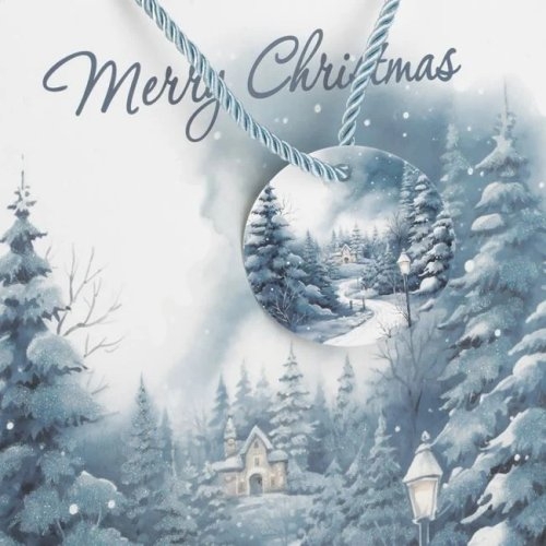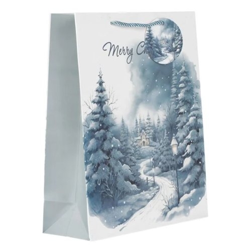 Sacosa Cadou de Craciun Peisaj Inzapezit Bleu cu Glitter 26x10x32cm