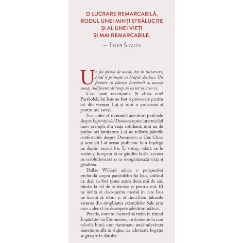 Dallas Willard ne dezvaluie frumusetea acestor pilde cu o pricepere nemaivazuta si intr-un mod atat de fermecator incat, la final, ajungem sa fim captivati de maretia si bunatatea lui Dumnezeu.