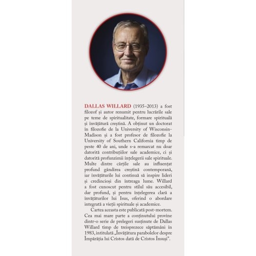 Dallas Willard (1935–2013) a fost filozof si autor renumit pentru lucrarile sale pe teme de spiritualitate, formare spirituala si invatatura crestina. A obtinut un doctorat in filozofie de la University of Wisconsin-Madison si a fost profesor de filozofie la University of Southern California timp de peste 40 de ani, unde s-a remarcat nu doar datorita contributiilor sale academice, ci si datorita profunzimii intelegerii sale spirituale. Multe dintre cartile sale au influentat profund gandirea crestina contemporana, iar invataturile lui continua sa inspire lideri si credinciosi din intreaga lume. Willard a fost cunoscut pentru stilul sau accesibil, dar profund, si pentru intelegerea clara a invataturilor lui Isus, oferind o abordare integrata a vietii spirituale si academice.