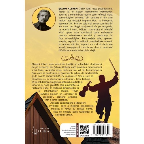 Plasată într-o lume plină de tradiții și schimbări, Scripcarul de pe acoperiș, de Șalom Alehem, este povestea emoționantă a lui Tevie, un lăptar evreu dintr-un mic sat din fostul Imperiu Rus, care se confruntă cu provocările aduse de modernitate și de soarta imprevizibilă. Pe măsură ce fiicele sale se căsătoresc și își aleg propriile drumuri, Tevie trebuie să își echilibreze dragostea paternă, credința și umorul cu noile realități care amenință să-i răstoarne viața. În mijlocul dificultăților și al schimbărilor sociale, Tevie rămâne precum un „scripcar pe acoperiș”, căutând armonia într-o lume instabilă. Această capodoperă a literaturii evreiești, care a inspirat spectacolul musical și filmul cu același nume, este un omagiu adus rezilienței și spiritului uman.