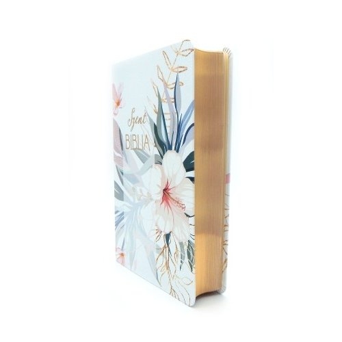 Bőrhatású, fehér színű, közepes Biblia virágmintával, arany színű gerinccel a Patmos kiadásában. Részletes térképekkel, kronológiai táblázatokkal, kereszthivatkozásokkal, Jézus szavai piros kiemeléssel. Exkluzív minőség: arany színű lapszél, varrott szegély, karton védőtok.