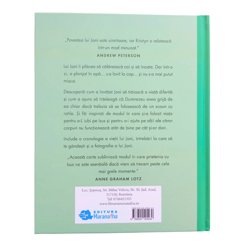 DESCRIERE:Inspiră-i pe copii să se încreadă în Dumnezeu și să-i iubească pe ceilalți, chiar și atunci când se confruntă cu mari provocări. Cei mici vor vedea cum Dumnezeu are grijă de noi citind despre copilăria plină de viață a lui Joni Eareckson Tada, accidentul care i-a schimbat viața și adaptarea dificilă la un mod de trai cu totul diferit. Vor descoperi cum Dumnezeu a folosit-o în moduri uimitoare pentru a-i binecuvânta pe ceilalți.