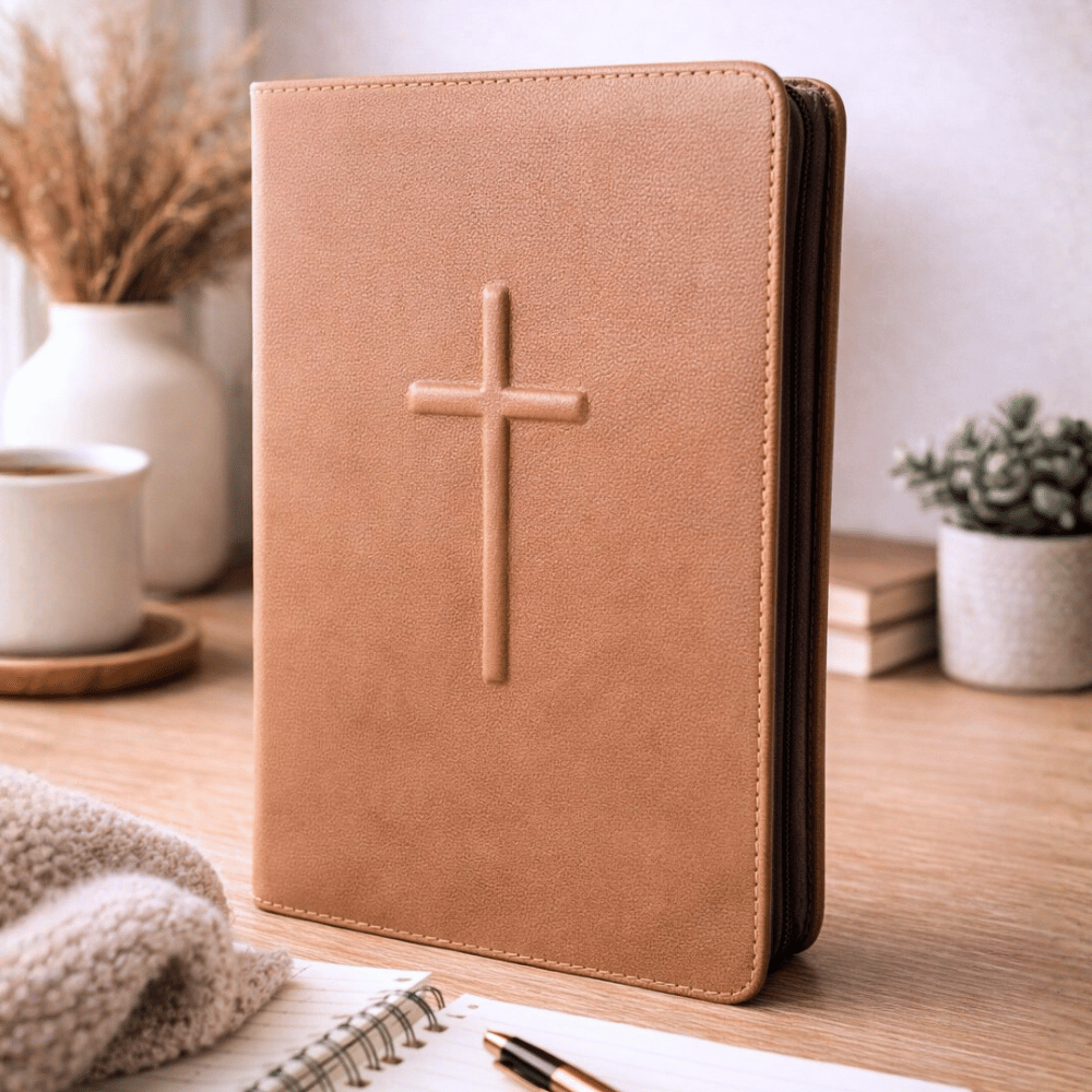 Biblia mare, coperta piele, maro închis, fermoar maro închis, index, aurita, cruce in relief, cuv. lui Isus cu rosu [073 PFI]