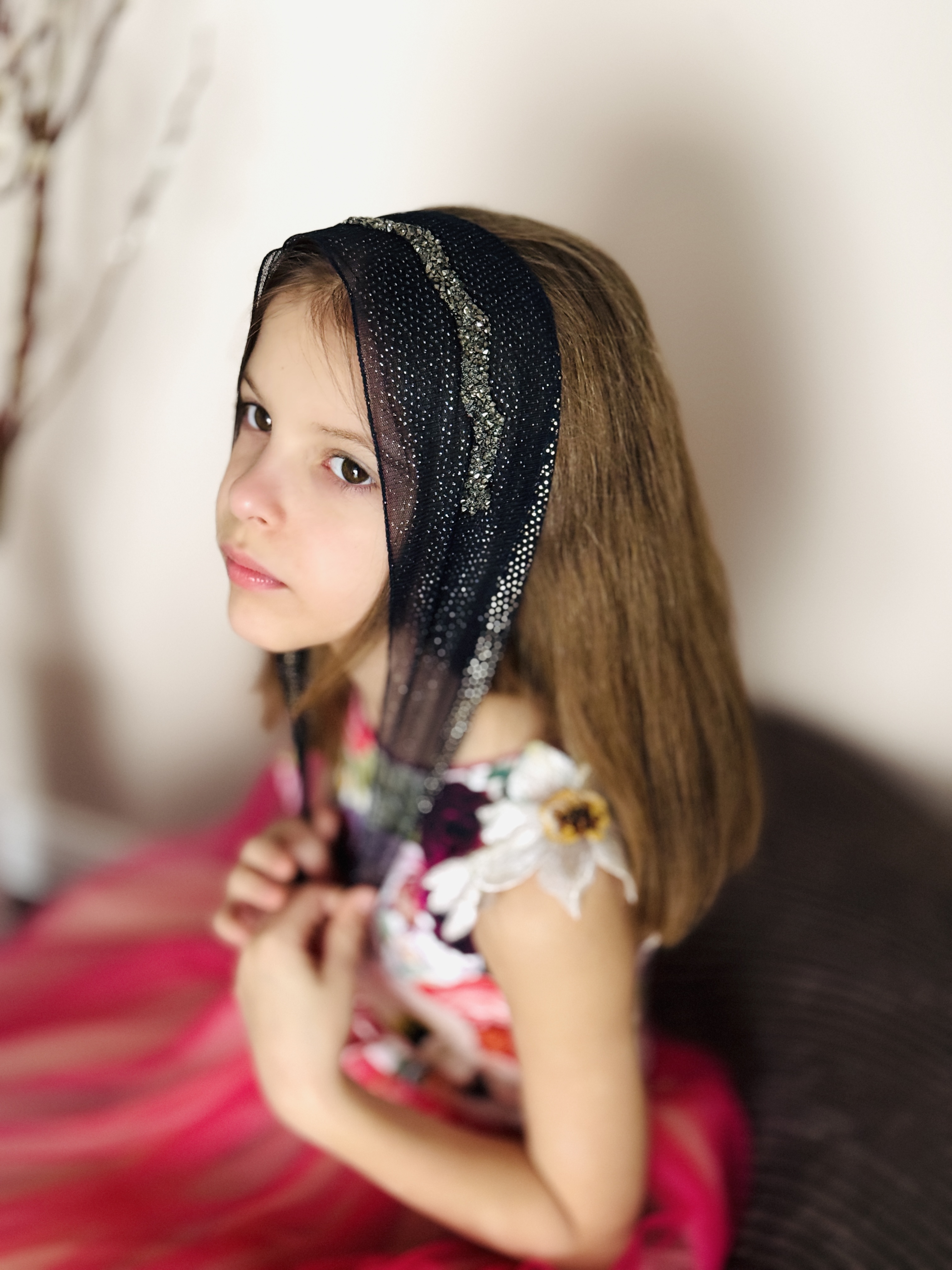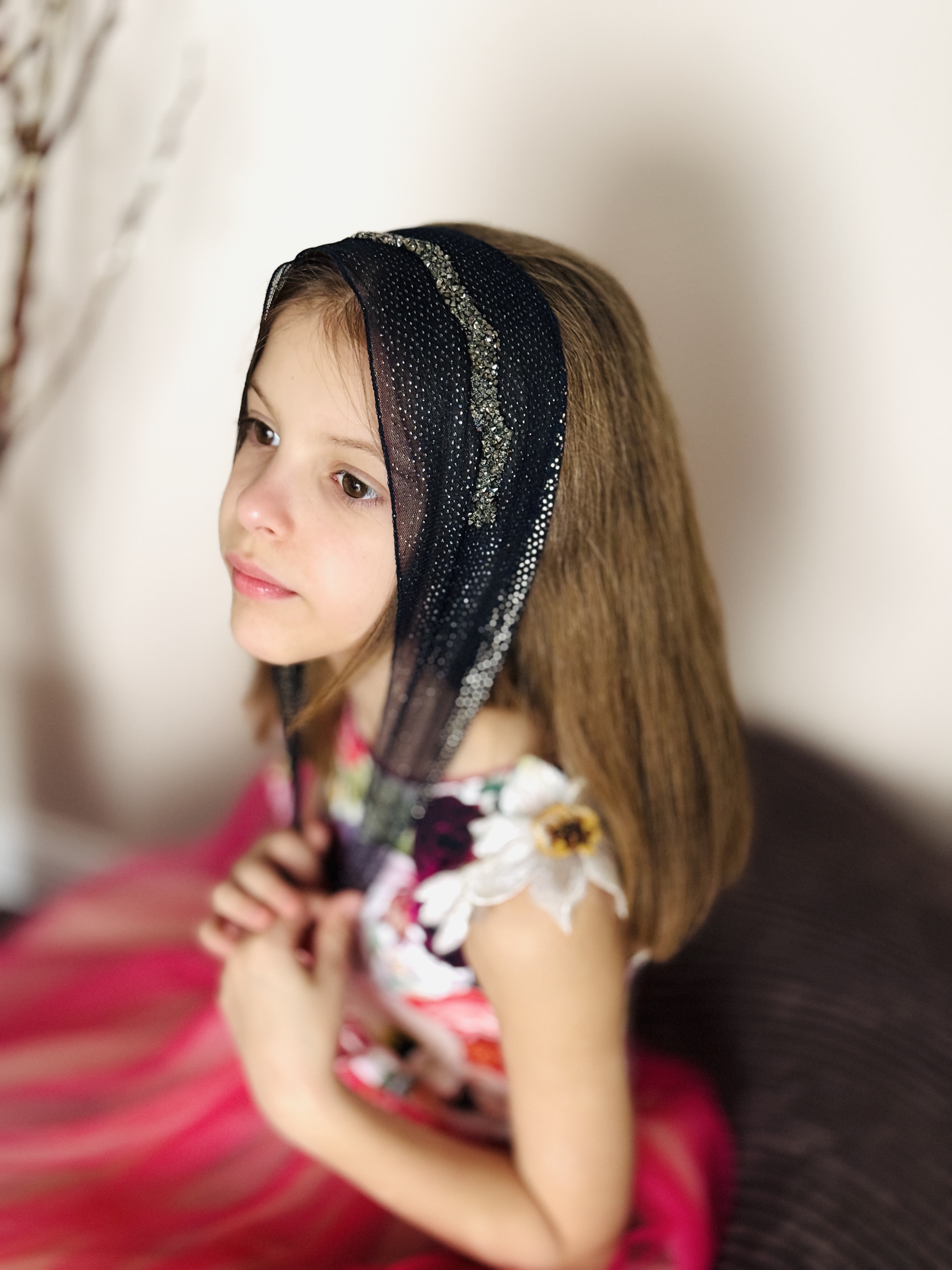 Bentiță din tul - neagra cu sclipici si pietre maro
