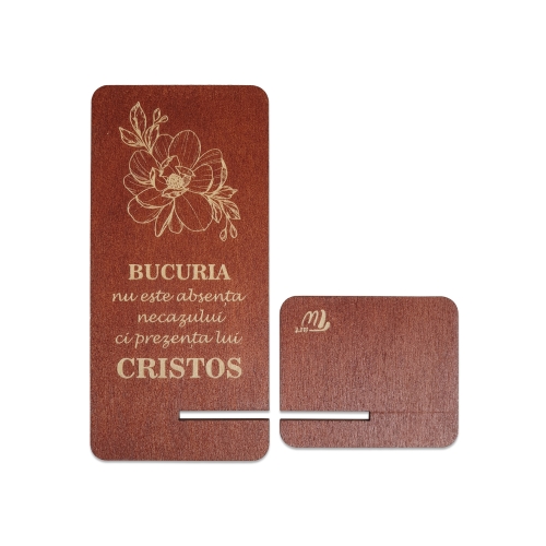 Suport telefon mobil, din lemn, culoare maro roscat, cu mesaj crestin - Bucuria