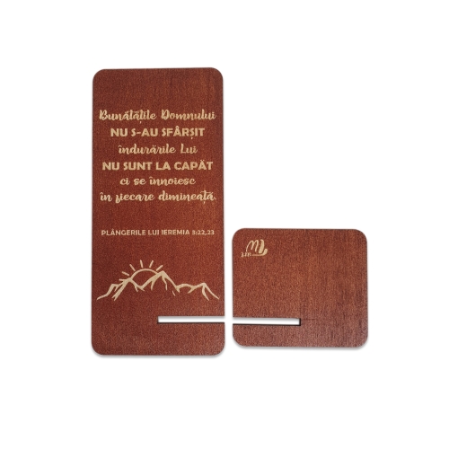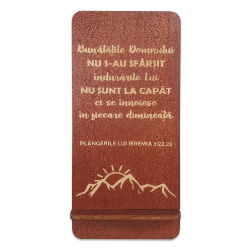 Suport telefon mobil, din lemn, culoare maro roscat, cu mesaj crestin - "Bunatatile Domnului nu s-au sfarsit"