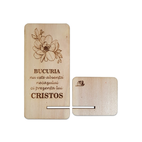 Suport telefon mobil, din lemn, culoare natur, cu mesaj crestin - Bucuria