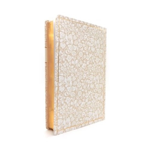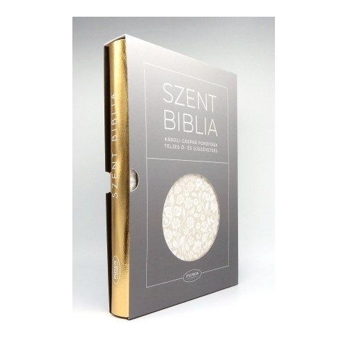 Bőrhatású, drappszínű, nagy Biblia, virágmintával, arany felirattal és gerinccel, a Patmos kiadásában. Részletes térképekkel, kronológiai táblázatokkal, kereszthivatkozásokkal, Jézus szavai piros kiemeléssel. Exkluzív minőség: arany színű lapszél, varrott szegély, karton védőtok.